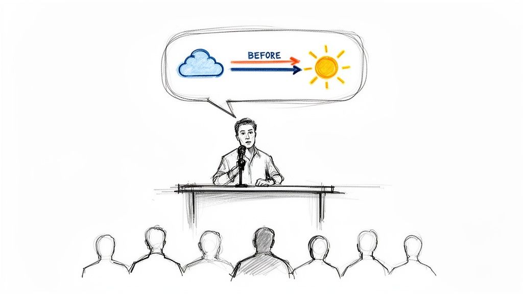 - Define the "Before": Grab a piece of paper and write down the specific, nagging problems your ideal student faces. What frustrations keep them stuck? For example, a "before" state for a social media course might be: “Posting content daily but getting zero engagement or leads.”