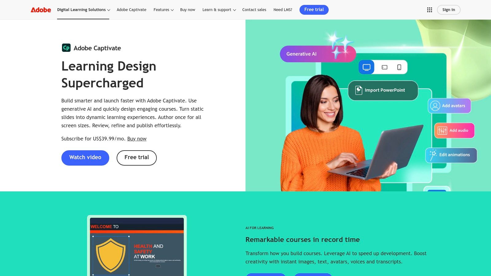 Adobe Captivate turns PowerPoint decks into responsive SCORM courses with AI-generated assets.